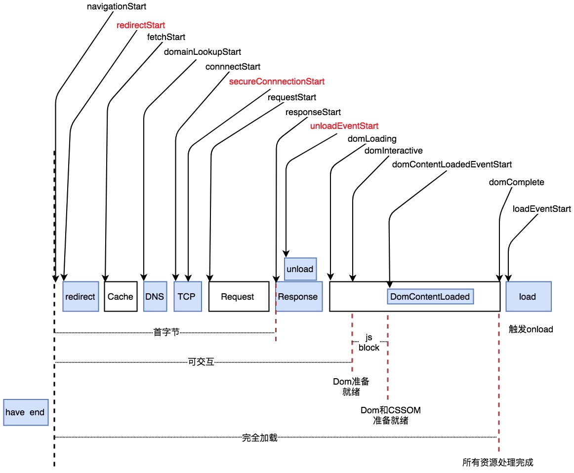 - 重定向:重定向后需要加载新页面。对浏览器来说,新页面加载时间从redirectStart开始。对用户来说,显示时间为重定向前后页面之和